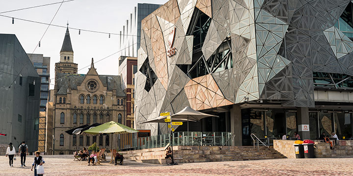 On the map: Since its opening in 2002, Federation Square has brought cultural attractions, world-class events, and a wide range of restaurants and bars to the people of Melbourne. Not only do performances and exhibits take place in the center of the square, they also line the square. When visitors first step into Federation Square, they are greeted with eye-catching architectural masterpieces: The Ian Potter Centre: NGV Australia and the Australian Centre for the Moving Image (ACMI). After visiting the museums, we suggest heading outside to enjoy a free performance or a refreshing beverage. Stop by the Melbourne Visitor Centre - located underground with an entrance at the main corner of Fed Square - for some information on the city and the current (and upcoming) happenings at Federation Square.