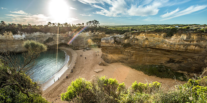 Situated in Port Campbell National Park, just up the road from the 12 Apostles, the Loch Ard Gorge is a must-see for those traveling along the Great Ocean Road. This picturesque gorge features a clear, blue bay, surrounded by two yellow-washed cliff faces. The gorge received its name in 1878 from a large clipper ship from England (engraved with the name Loch Ard) beached on nearby Muttonbird Island. Out of the 54 passengers on the ship, only two survived - teenagers Tom Pearce and Eva Carmichael. In June 2009, the arch of Island Archway fell in on itself, leaving two separate rock hunks that run parallel to each other. The two hunks of rock were subsequently named after the ship’s two survivors - Tom and Eva.