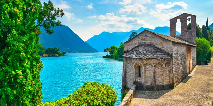 Bellagio is considered the pearl of Lake Como, a top lakeside vacation destination, and one of the most romantic places to visit in Italy. Bellagio boasts panoramic lake views and a fairly mild climate. The charming lakeside promenade leads to Villa Melzi with its beautiful gardens. The village features picturesque stone lanes and stairways with little shops, gelato bars, cafes, and restaurants. Nearby is the Tower of the Arts, a venue for exhibitions and performances, and the Romanesque San Giacomo Church. Bellagio has been a favored summer resort since Roman times. They planted olive and laurel trees, and later Italians grew camellias and rhododendrons around their villas. You can launch into the lake, or stroll through town.